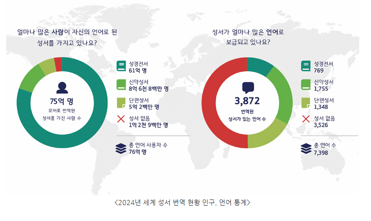 전 세계 61억 명이 성경전서를 갖게 되었고 자신의 언어로 번역된 신약성서를 갖게 된 사람들은 8억 6천 8백만 명, 부분적으로 번역된 성서를 갖게 된 사람들은 5억 2백만 명이다. 하지만 1억 2천 9백만 명의 사람들이 사용하는 전 세계 언어 절반가량은 아직 성서조차 번역되지 않았다. 2024년 한 해, 성경전서와 신약성서, 단편성서를 포함하여 74개의 언어로 첫 번역 성서가 출판되었다. 이 가운데 16개 언어는 성경전서로, 16개 언어는 신약성서로, 42개의 언어는 단편성서로 번역되었다.