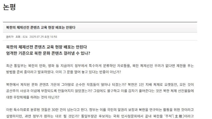 이어 “북한에서 제작된 문화 콘텐츠 가운데 그야말로 순수한 작품들이 얼마나 되겠는가? 북한은 1인 지배 체제로 오랫동안, 모든 것이 공산주의 사상과 이념에 부합되도록 만들어지지 않았겠는가? 그럼에도 불구하고 이를 갑자기 풀어준다는 것은 북한 체제 선전물들에 대한 무장해제를 하려는 것이 아닌가?”라고 했다.