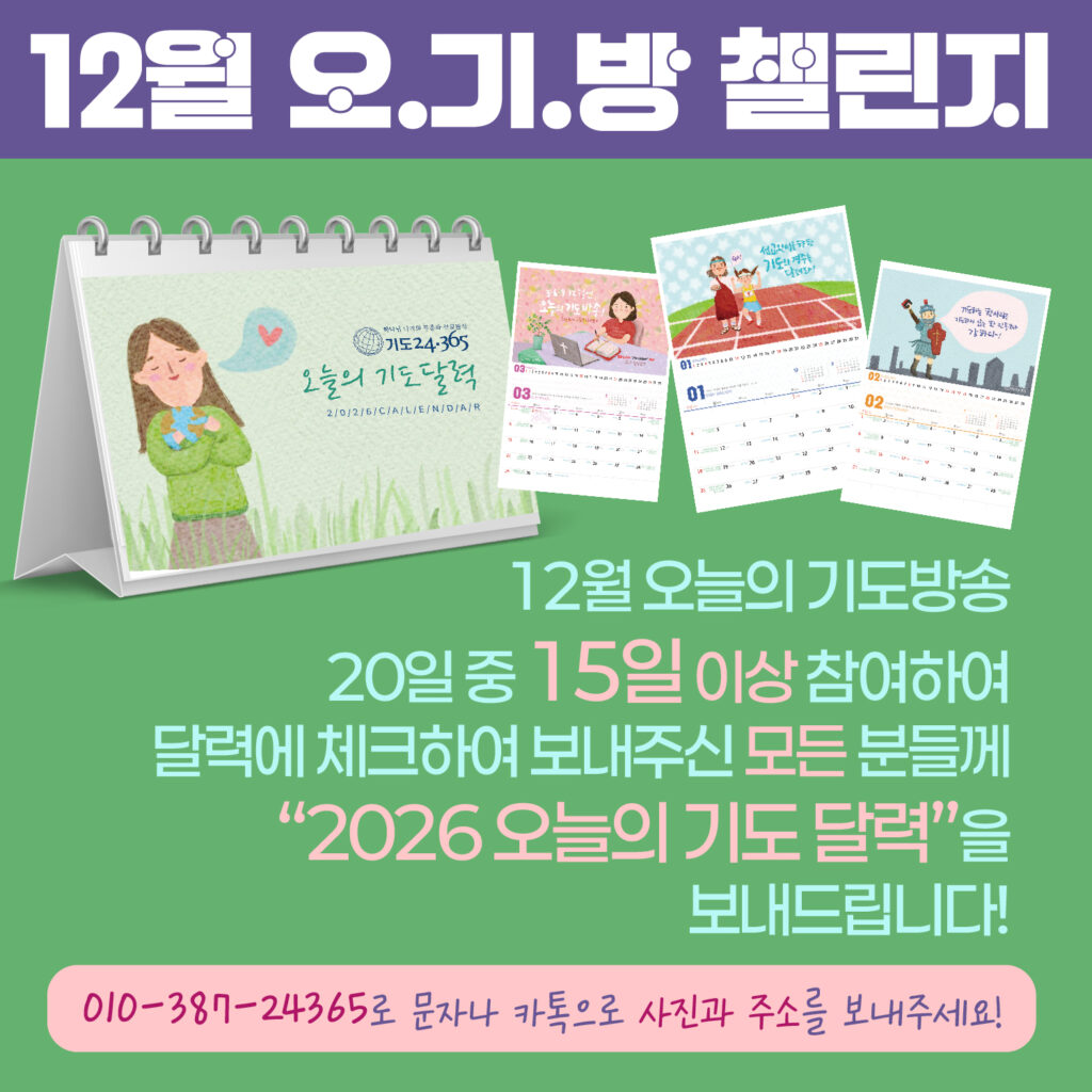 12월 중 진행되는 총 20회 오기방 중 15회 이상 출석하기!달력에 체크하기!체크한 달력을 12월 마지막 주에 사진으로 찍어 자신의 주소와 함께 아래 번호로 보내주세요!