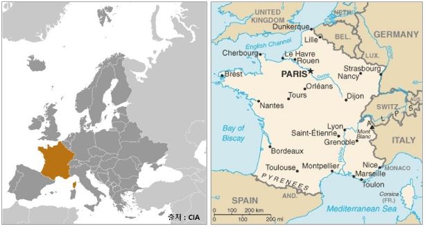 Area | 549,970㎢, Situated in Western Europe, France borders the North Atlantic Ocean and the Mediterranean Sea.