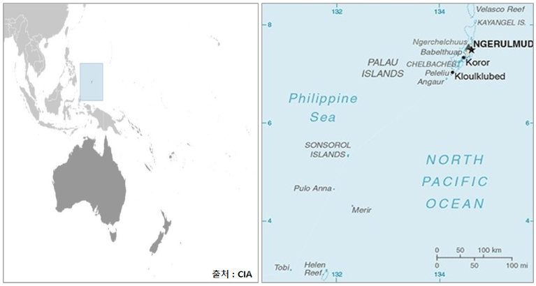 Area |459㎢, located in the western Pacific Ocean. Although Palau consists of 343 islands, only 9 are inhabited.