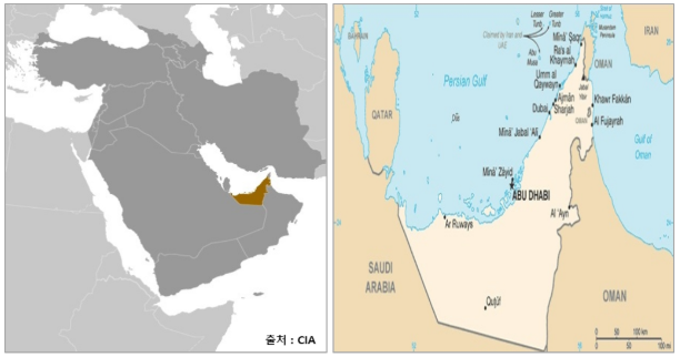 Area | 83,600㎢, located along the eastern coast of the Arabian Peninsula on the Persian Gulf, composed of seven emirates: Abu Dhabi, Dubai, Sharjah, Ras Al Khaimah, Ajman, Umm Al Quwain, Fujairah